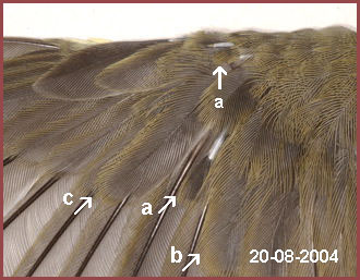 présentant des franges serrées avec un teinte moins diffuse que (b). 46. Certes, il y une différence de forme et de fraîcheur des rectrices centrales en croissance, cet oiseau fait partie des 38% qui muent une paire de rectrices toutefois, la perte accidentelle n'est pas à exclure, ce critère n'est pas fiable. |