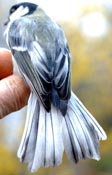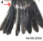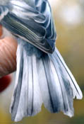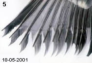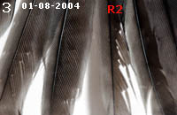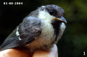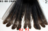 4. Cette autre mésange charbonnière juvénile baguée le 04/08/2004 présente également des barres de croissance aux rectrices. Pour elle, les dégâts se situent au tiers supérieur des plumes ce qui implique une pénurie alimentaire plus tôt après l'éclosion. Cet oiseau pesait 17.6 gr. un poids normal à son âge, la carence fut courte et elle bénéficiât d'une bonne alimentation les jours suivants. |