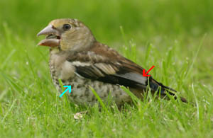 Cet oiseau présente une mue complète des rectrices qui se présente sous forme d'une croissance étagée, le remplacement commence par la paire centrale et se termine par la paire externe. Cette stratégie dans la mue des rectrices dès la fin de l'été renouvelle donc les plumes juvéniles atteintes par des barres de croissance. Par contre les rémiges ne mueront que l'été suivant. |
